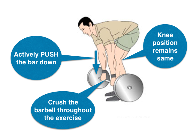 Bend your knees slightly and Grab the barbell or dumbbell by maintaining your upper back parallel to the floor. Keep the bar close to your shins as even 2 inch far off will reduce leverage and might cause stress on the lumbar vertebrae {disc and ligament injury}.
